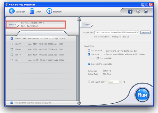 画面左の「Source」に「Disc Name」と「DRM」が表示されます。