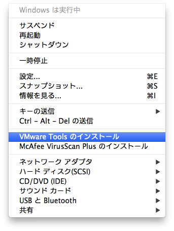 - VMWare Fusion 4 の [仮想マシン]-[VMWare Tools のインストール] を選択