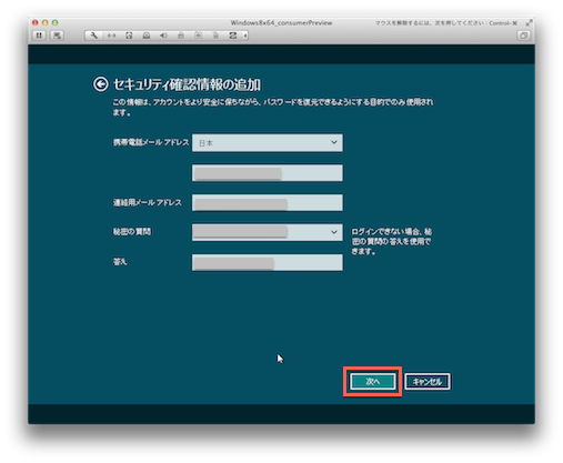 - 「セキュリティ情報の追加」画面で各種情報を入力後に「次へ」をクリック