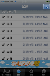 「ねむログ」に記録した睡眠のデータをリスト形式、もしくは棒グラフで見ることができます。