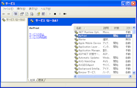そこで「コントロールパネル」→「管理ツール」→「サービス」からBonjourを再起動(AirPrintも再起動を選択)
