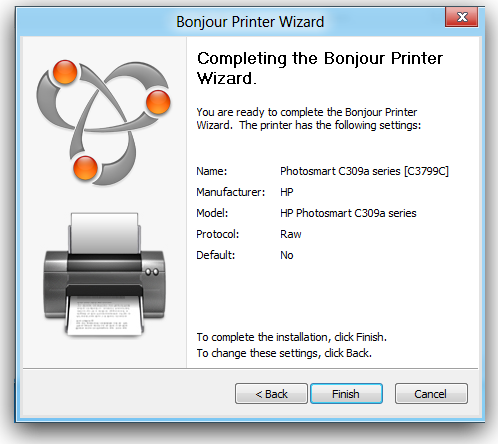 プリンターの情報が表示されるので「Finish」をクリックして終了します。