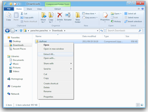 - ダウンロードした AirPrint.zip を右クリックして「Extract All…」を選択して展開