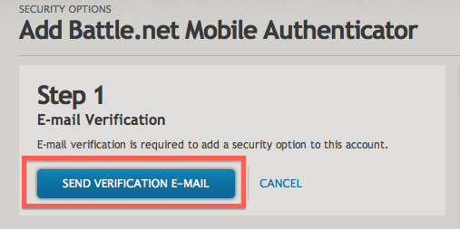 3. 「Add Battle.net Mobile Authenticator」画面の「Step 1」で「SEND VERIFICATION E-MAIL」をクリック