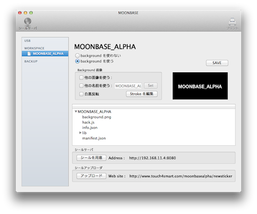 ちなみに、サムネイル画像は Mac の MoonBase/Workspace/シールプロジェクト名 フォルダに、シールプロジェクト名_thumbnail.png として用意されています。 - ファイル(moon.zip)